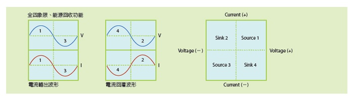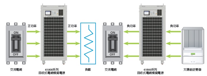 Chroma 61800-100 回收式电网模拟电源是一款定电压输出的可编程交流电源,可应用于一般用电产品(例如: 家电产品,开关式电源)的测试,测试时Chroma 61800-100回收式电网模拟电源会对负载输出功率,通过拉载过电流设定(OCP)功能来保护Chroma 61800-100。当待测物为能将能量回馈到电网的产品(例如:太阳能逆变器,双向充放电机)等分散式发电设备时,Chroma 61800-100在输出电压的同时,若侦测到输出得功率为”负(-)”功率时,Chroma 61800-100就会启动能源回收机制,将逆变器所产生的逆灌电流/负功率能量转换到交流电网。通常的交流电源无法承受待测物回灌的能量。Chroma 61800-100可应用到正负电压/电流正反方向的四象限,且具备能源回收功能,正足以成为电网模拟电源。