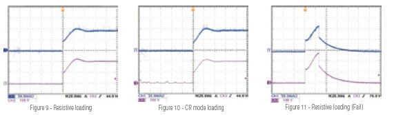 图9是以真实电阻为负载的拉载电流波形(蓝色);图10为定电阻模式仿真真实电阻的拉载电流波形(蓝色);图9与图10的电流与LED为负载的电流波形有相当大差异,且电流及电压都有过冲的情况发生,易导致LED driver在开机时发生过电压或过电流保护,如图11所示。因此不管是真实电阻或是电子负载的定电阻模式,都比较无法仿真真实的情况。