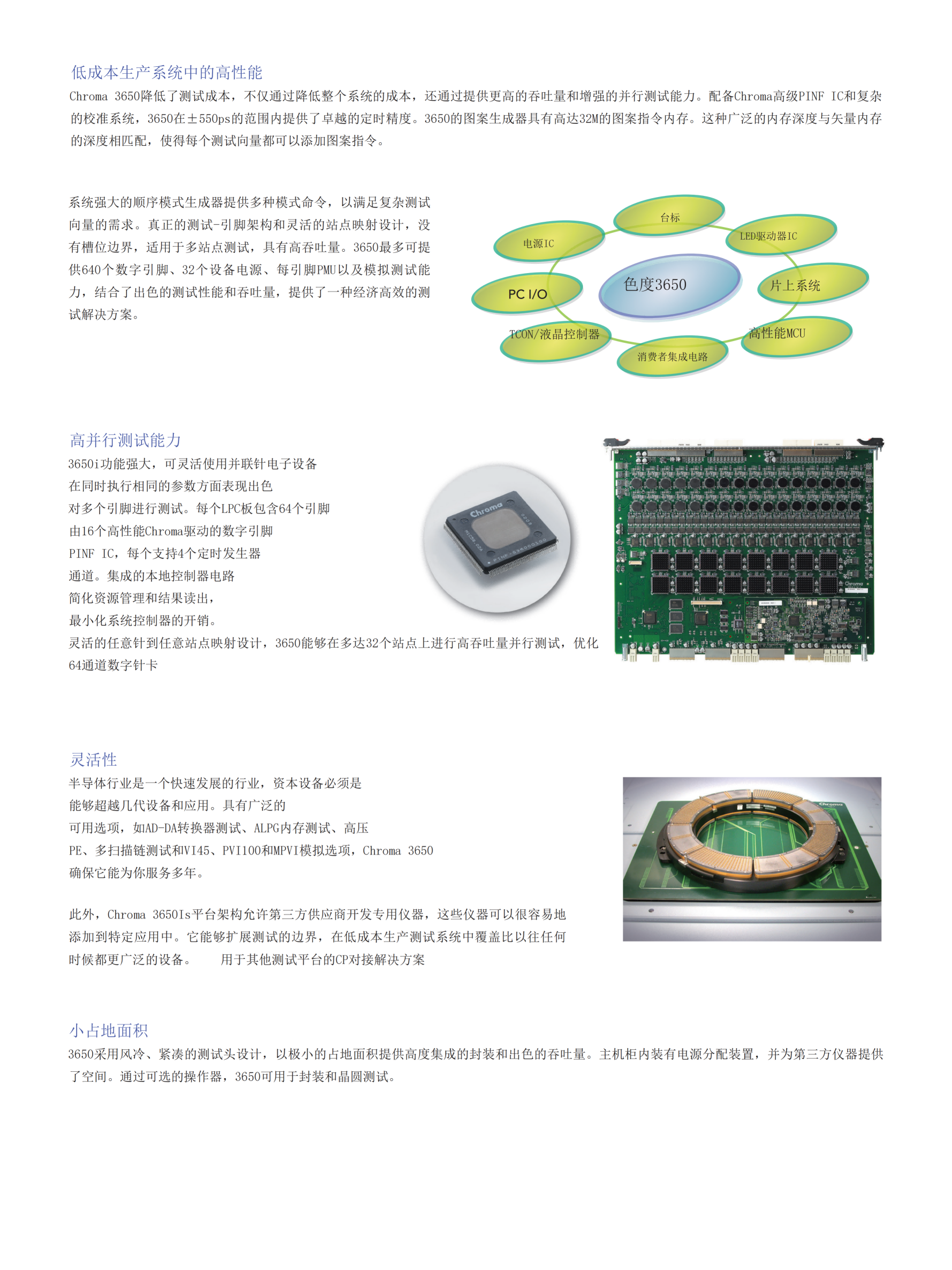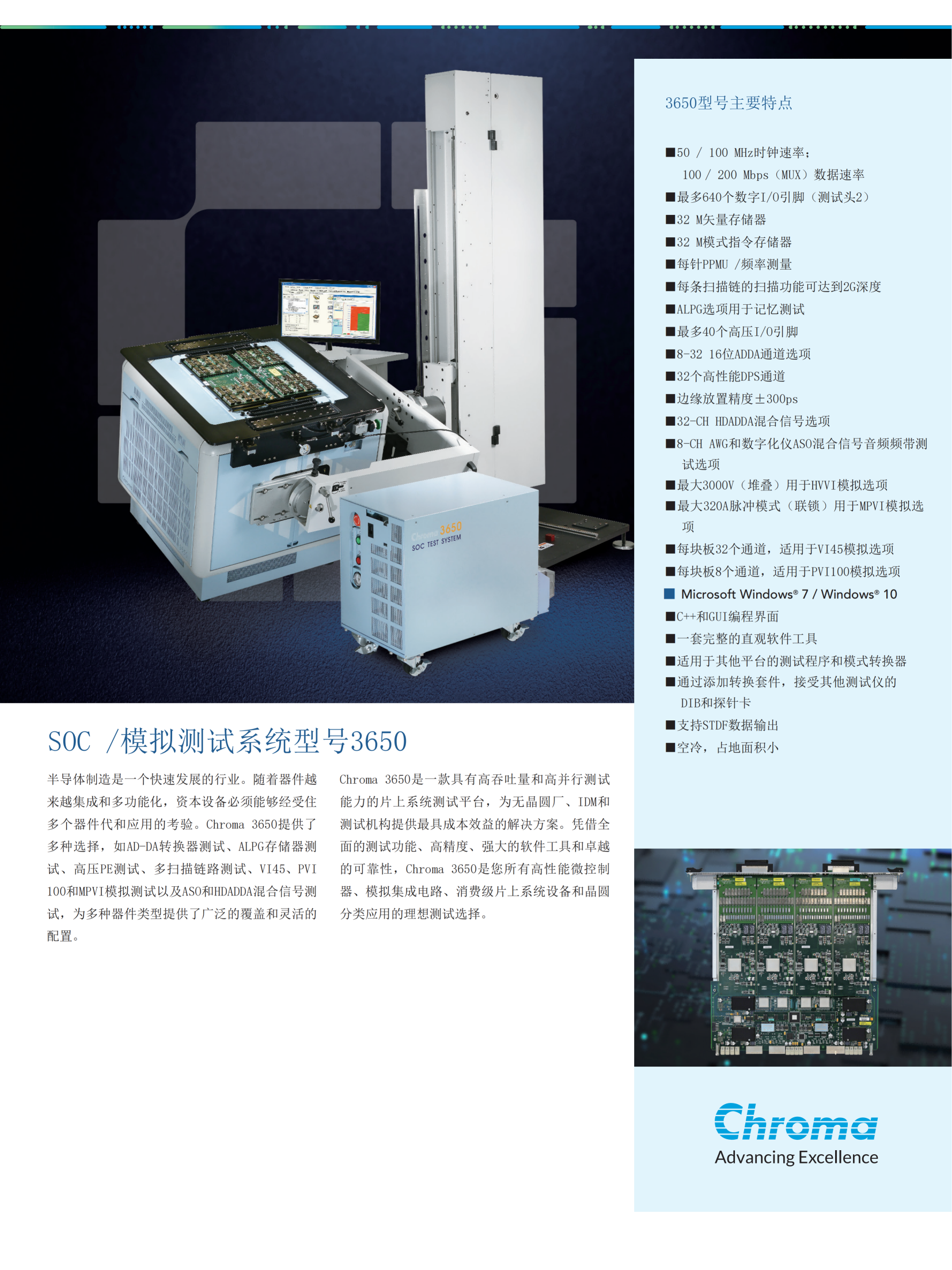 Chroma 3650是一款具有高吞吐量和高并行测试能力的片上系统测试平台,为无晶圆厂、IDM和测试机构提供最具成本效益的解决方案。