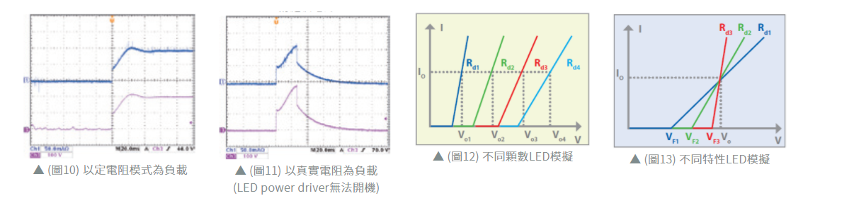 图9与图10的电流与LED为负载的电流波形有相当大差异,且电流及电压都有过冲的情况发生,易导致LED driver在开机时发生过电压或过电流保护。