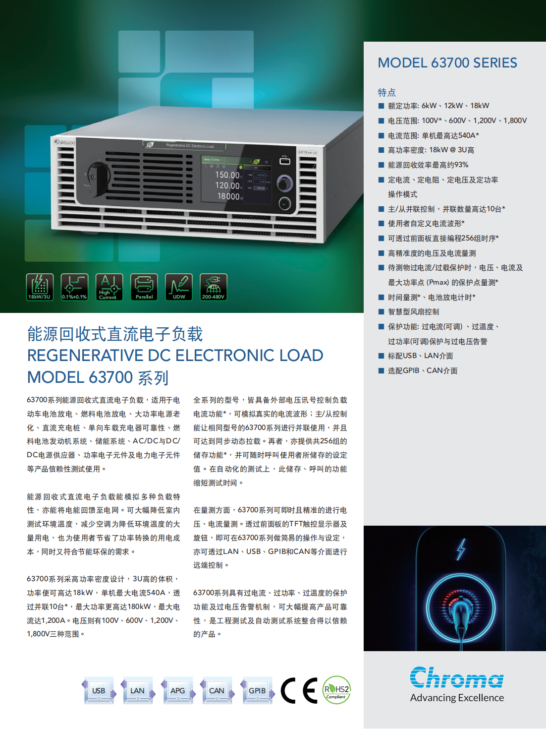 63700系列能源回收式直流电子负载,适用于电动车电池放电、燃料电池放电、大功率电源老化、直流充电桩、单向车载充电器可靠性、燃料电池发动机系统、储能系统、AC/DC与DC/DC电源供应器、功率电子元件及电力电子元件等产品信赖性测试使用。